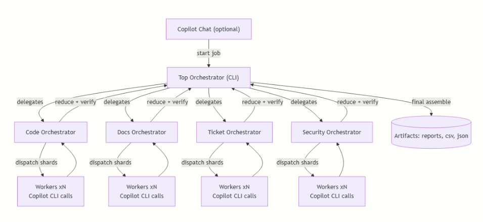 Rather than relying on a single general-purpose prompt, workflows can create domain-oriented orchestrators that coordinate their own worker pools.